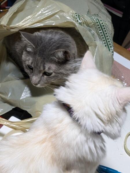 猫って 本当に袋とかに入るんですね!! もう一匹も入りたいのか