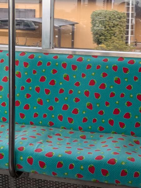自称ですが 可愛い! を売りにしょうかと! イチゴをイメージフルーツに\(°o°)/ こんな電車が有るん、ですね╮(. ❛ ᴗ ❛.)╭