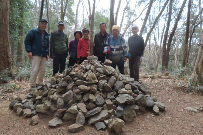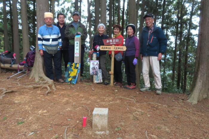 参加者と共にかまど山山頂にて 293.21m 山頂には鬼滅の刃グッツが置かれています