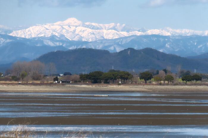 干し上げの最終段階に入った谷中湖と白銀に輝く日光白根山