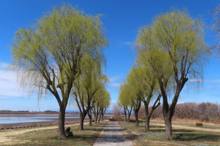 芽吹き始めた谷中湖中の島のヤナギの並木