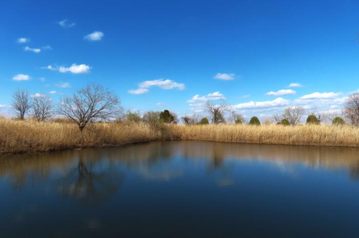 ヨシ焼きの痕跡が残る渡良瀬遊水地と渡良瀬川を分ける土手