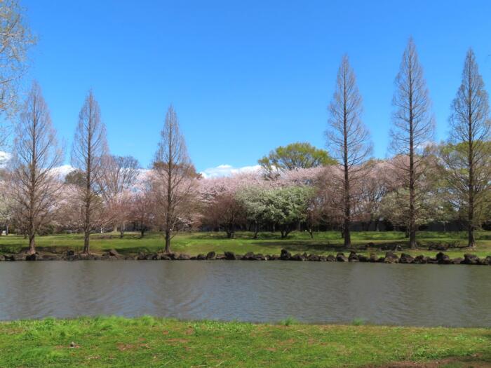 桜と新録に彩られているはなさき公園「鯉の池」周辺