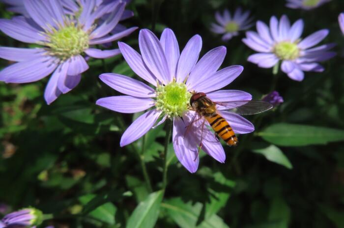 ミヤコワスレ(キク科)の蜜を吸っているハチ
