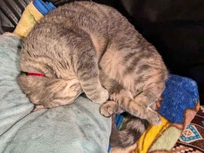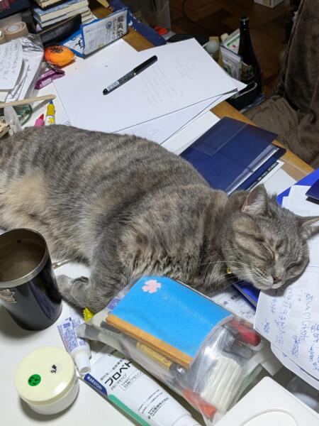 何か広げると 邪魔をしにきて そのまま寝てしまった! 丸くならないです\(°o°)/ そばで丸くなって 寝てしまったのも 居るし