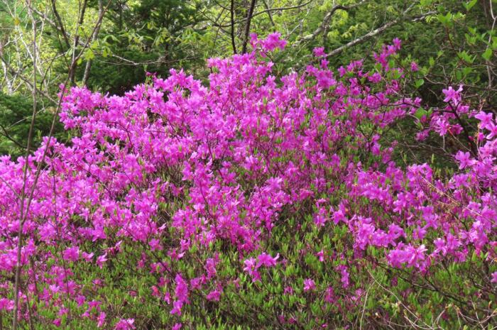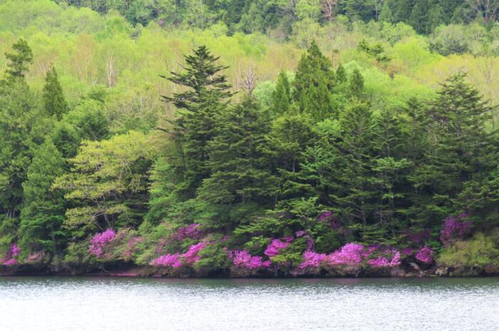 トウゴクミツバツツジに染まる「湯ノ湖」