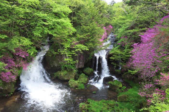 トウゴクミツバツツジに囲まれる「竜頭の滝」