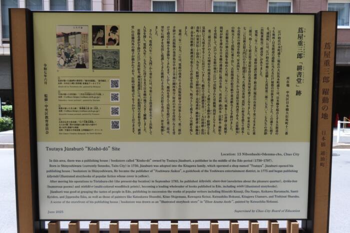 蔦屋重三郎が日本橋に耕書堂を出した場所にある案内パネル