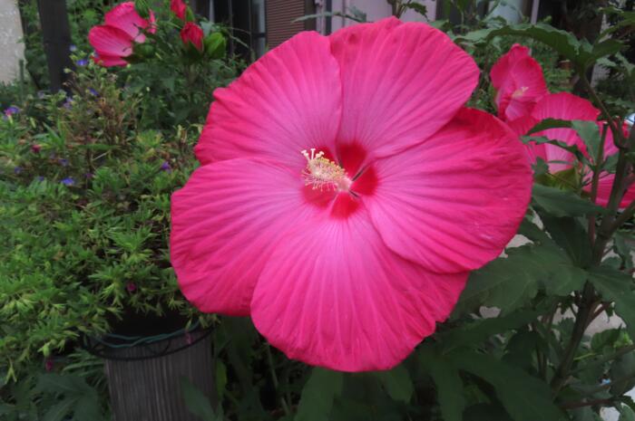 アオイ科フヨウ属でアメリカフヨウの仲間である「タイタンビカス」が咲き始めたので観に行ってきました、花の大きさは直径約25㎝くらいになる大型の花で強烈に目立つ植物です。