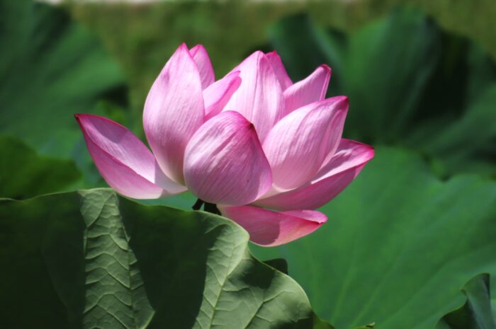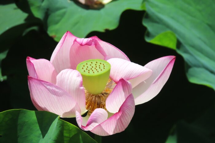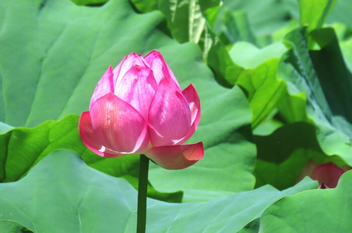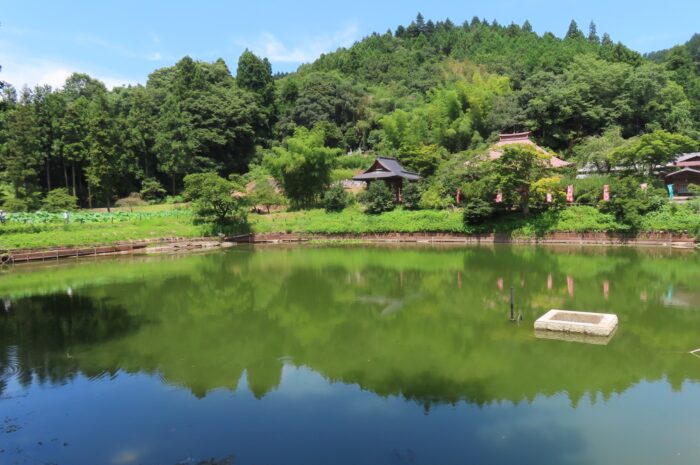蓮が咲き乱れる久昌寺弁天池 左奥に見えるのが観音堂