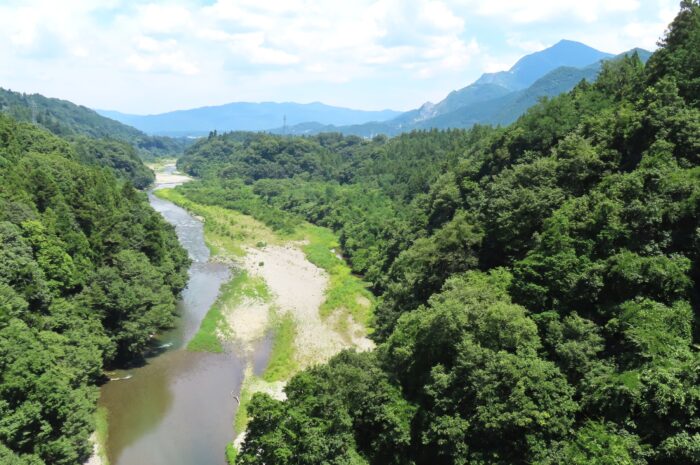 日野鷺橋から荒川下流を望む 右奥の山が武甲山