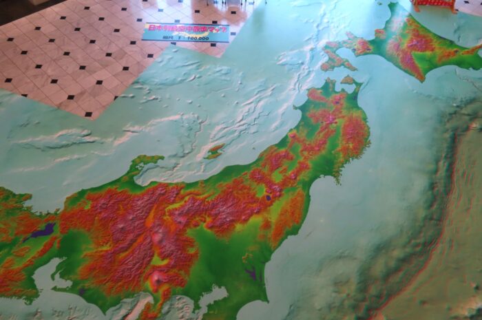 館内床に画かれている縮尺1:100000で作られている「3Dマップ」 空中散歩として楽しめます