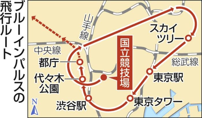 飛行経路 国立競技場→東京スカイツリー→東京駅→東京タワー→渋谷駅付近→代々木公園付近→都庁
