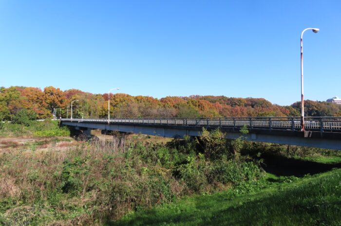 都幾川に架かる「二瀬橋」奥に見える森が菅谷館跡です