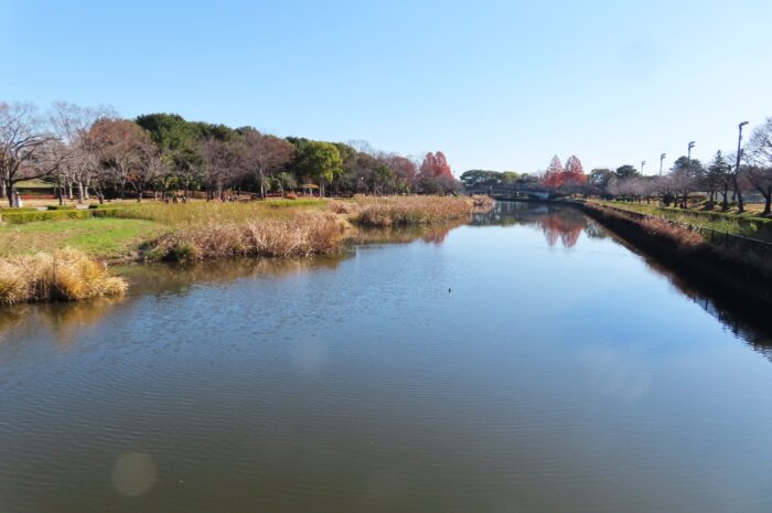 館林市の文化施設地区とつつじが岡公園を結ぶ「尾曳橋」橋の下は鶴生田川です