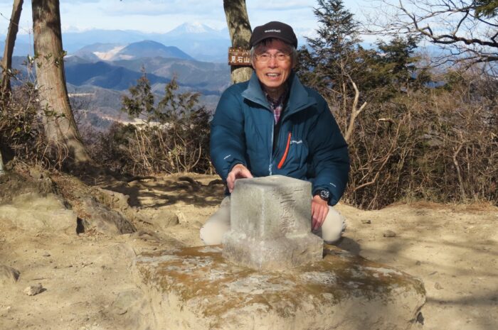 アイキャッチ画像はお大平山系の最高峰である晃石山(419.04m)山頂にて(一等三角点峰) 背景に見えるのは男体山