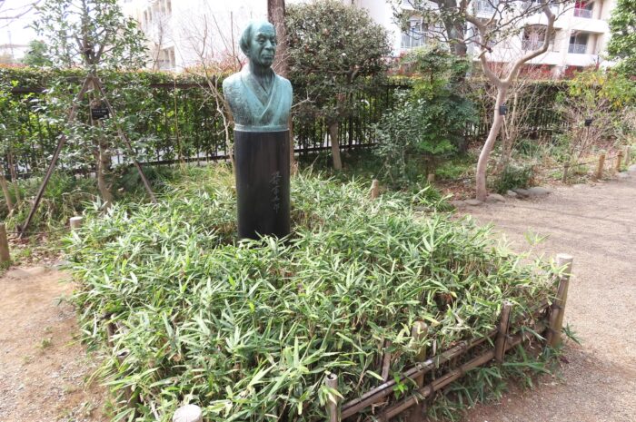 園内にある奥様の名前を付けた「スエコザサ」に囲まれている牧野博士の胸像