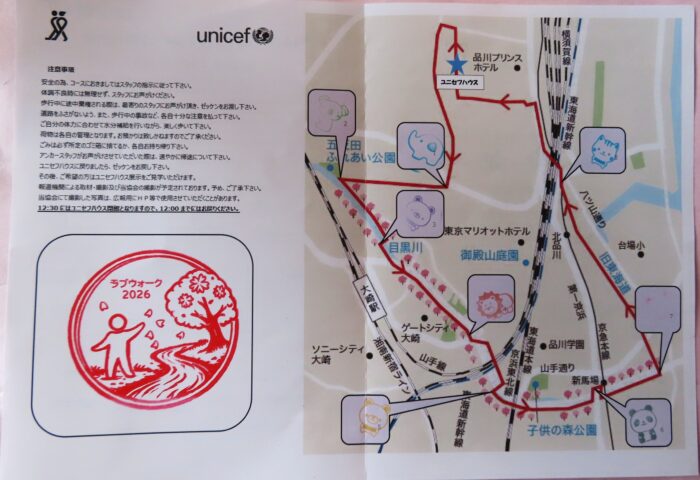 日本ユニセフ協会主催の「ユニセフ・ラブウォーク中央大会」のスタンプラリーに参加してきました、コースはユニセフハウス(受付)⇒高輪⇒目黒川⇒荏原神社⇒旧東海道⇒八ツ山橋⇒ユニセフハウス、約6㌔、約2時間、高輪、目黒川沿いの桜並木、北品川の旧東海道等をスタンプを頂きながら春の一時を楽しんで来ました、因みに参加費が寄付になります、帰りに芝増上寺へお花見散策を兼ねて参拝してきました。
