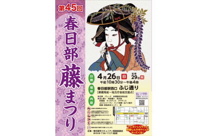 2026.04.13 事務局 akasaka 第48回春日部藤まつり 来る4月26日(日曜日)春日部市コミュニティ推進協議会による「第48回春日部藤まつり」が開かれますのでご案内いたします 令和8年4月26日(日曜日)午前10時30分~午後4時(延期時も同じ) (雨天延期:29日(祝日・水曜日)再雨天時は中止) (延期・中止の決定: 午前7時頃にコミュニティ推進協議会X(旧ツイッター)にて開催/延期/中止を発信。午前8時頃に安心安全メール発信、午前8時30分に防災行政無線放送。) 尚、藤まつり詳細は春日部市役所HPをご覧ください 1 個のコメント もう、ふじまつり!! 早いですね^_________^ 昨年は、ロープ持ちを しましたが 今年は、ちょっと 欠席に予定です 返信する コメントを残す コメントをキャンセルメールアドレスが公開されることはありません。 ※ が付いている欄は必須項目ですコメント ※ 名前 メール サイト 次回のコメントで使用するためブラウザーに自分の名前、メールアドレス、サイトを保存する。
