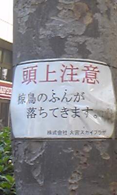 ムクドリのふんの警戒の写真です。 街路樹の保護と、住民への配慮の為! ムクドリは野鳥扱いなんで、駆除できないらしいです。 いろいろと保護するものが有り大変だ、、、 俺も保護されたい!!