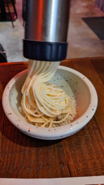 モンブランみたいでしょ! ポテトサラダなんですよ。 いぶりがっこの上にポテトサラダをトツピングして混ぜて食べるてすよ。 ちょとビックリ!